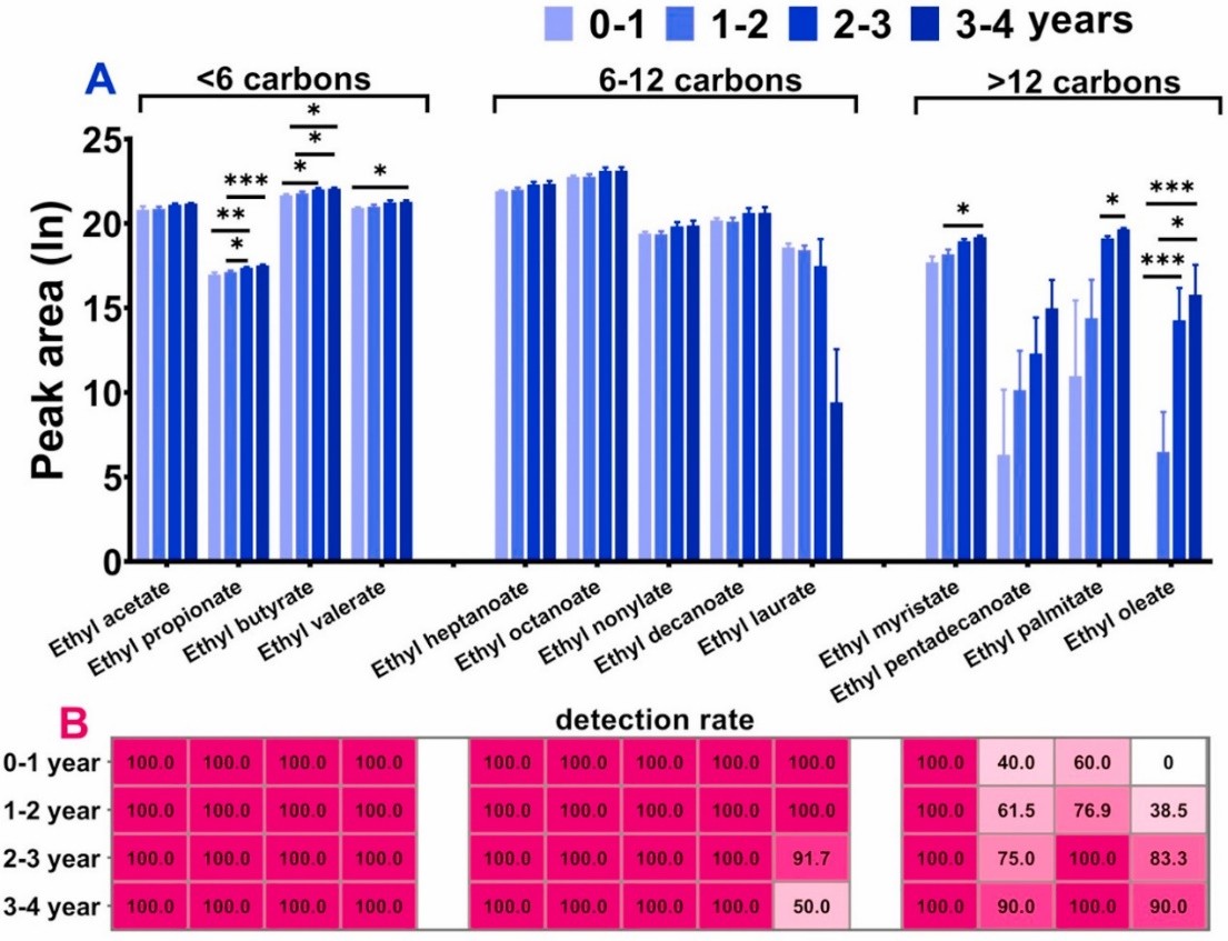 图3. 在不同品级的瓶装酒中,短、中、长链脂肪酸乙酯类化合物也体现出差异化的变化趋势,长链脂肪酸乙酯的检出率和储存时间有正相关关系