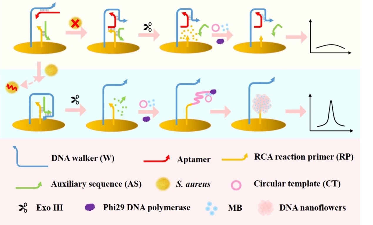 周楠迪教授团队开发了一种基于DNA步行器和DNA纳米花的电化学生物传感器用于金黄色葡萄球菌的检测。利用核酸适配体的高亲和力和特异性、DNA分子机器的机械运动以及DNA纳米花的独特性质,实现了金黄色葡萄球菌的高灵敏度检测。在该平台中,核酸适配体作为识别元件,与靶标金黄色葡萄球菌结合后触发DNA步行器在电极表面进行周期性运动,诱导释放出大量可用于滚环扩增反应的引物,后者通过滚环扩增反应在电极表面形成大量的自组装DNA纳米花。DNA纳米花的形成增加了电极表面电活性亚甲基蓝的结合位点,极大地提高了因金黄色葡萄球菌触发的电流信号。该生物传感器可检测60-6×108 CFU/mL动态范围内的金黄色葡萄球菌,检测限低至9 CFU/mL。该微生物检测平台基于高效的分子机器和独特的DNA纳米结构,具有良好的灵敏度、特异性和稳定性,在食品安全和环境监测方面显示出巨大的潜力。