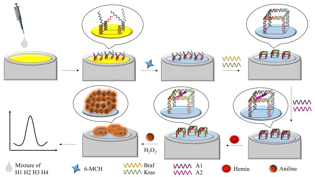 周楠迪教授团队开发设计了一种可固定在金电极表面的DNA纳米结构框架,该结构框架能够通过碱基互补配对原则与Kras DNA和Braf DNA特异性结合,形成完整的DNA六面体自组装结构,该六面体结构内建具有催化活性的G-四链体-血红素复合体(DNAzyme)。后者催化溶液中的苯胺发生聚合反应,形成聚苯胺并沉积于DNA六面体结构上,产生强烈的电化学信号。该生物传感器可同时检测从fmol/L到μmol/L极宽浓度范围内的Kras DNA和Braf DNA,对两种ctDNA的检测限分别达到了48.7 fmol/L和44.1 fmol/L。同时,该传感器对两种DNA的突变响应非常敏感,当Kras DNA或Braf DNA中任何一种发生单碱基突变后,完整的DNA六面体自组装结构和具有催化活性的DNAzyme无法形成,产生的电信号的急剧下降。该生物传感器被应用于对血清中的两种ctDNA的检测,具有优良的灵敏度、特异性和稳定性,在癌症的早期筛查和诊断方面显示出巨大的潜力。