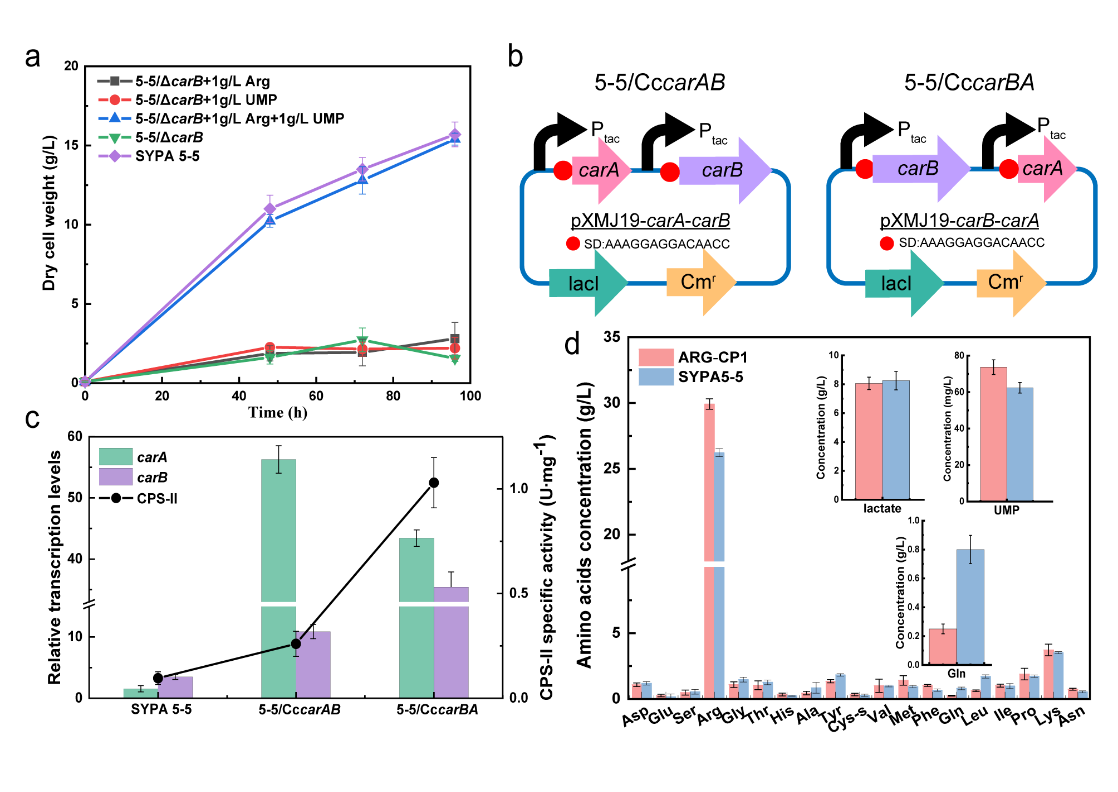 饶志明教授团队以钝齿棒杆菌SYPA5-5作为底盘细胞,敲除氨甲酰磷酸合成酶CPS II的大亚基编码基因carB,发现敲除菌株为L-精氨酸和嘧啶的双重营养缺陷型,证明了氨甲酰磷酸对于菌体生长代谢的重要性。为增加氨甲酰磷酸合成串联表达CPS II编码基因使酶活提高10.73倍,然后将谷氨酰胺合成酶GS的编码基因glnA的原始启动子替换为强启动子Psod,从而增加CPS II的底物供给,使L-精氨酸产量在摇瓶水平达到32.8±0.6 g∙L-1。表达E. faecalisV583来源的氨甲酰激酶CK为钝齿棒杆菌引入全新的氨甲酰磷酸合成途径,使其可以利用无机氨作为底物合成氨甲酰磷酸,胞内氨甲酰磷酸总合成速率提高10.35倍。敲除脱氢酶编码基因,使副产物乳酸合成量下降91.93%,同时节约NADH用于ATP生成,为氨甲酰磷酸合成增加ATP供应。最终获得的重组菌株在5L发酵罐水平可生产68.6±1.2 g∙L-1的L-精氨酸,较原始菌株提高54.5%,说明增加氨甲酰磷酸的供应是提高L-精氨酸生产的有效策略。