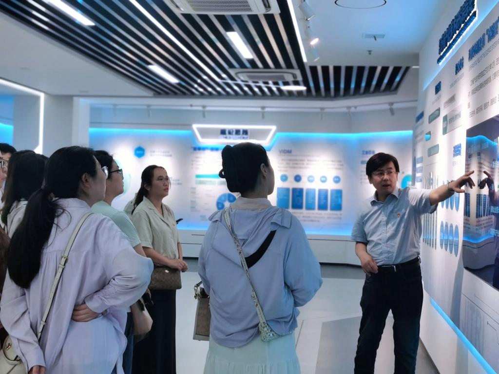 活动伊始,党员们走进江苏集萃创新中心展厅及党建、产改阵地。展厅内,集成电路领域的技术突破与产业化成果直观呈现,党建阵地通过文化墙、图文展板等形式,系统回顾了支部以党建引领业务发展的实践历程。参观过程中,双方围绕“党建如何赋能创新”展开即时交流,在思想碰撞中深化对“集萃・芯动力”党建品牌内涵的理解。