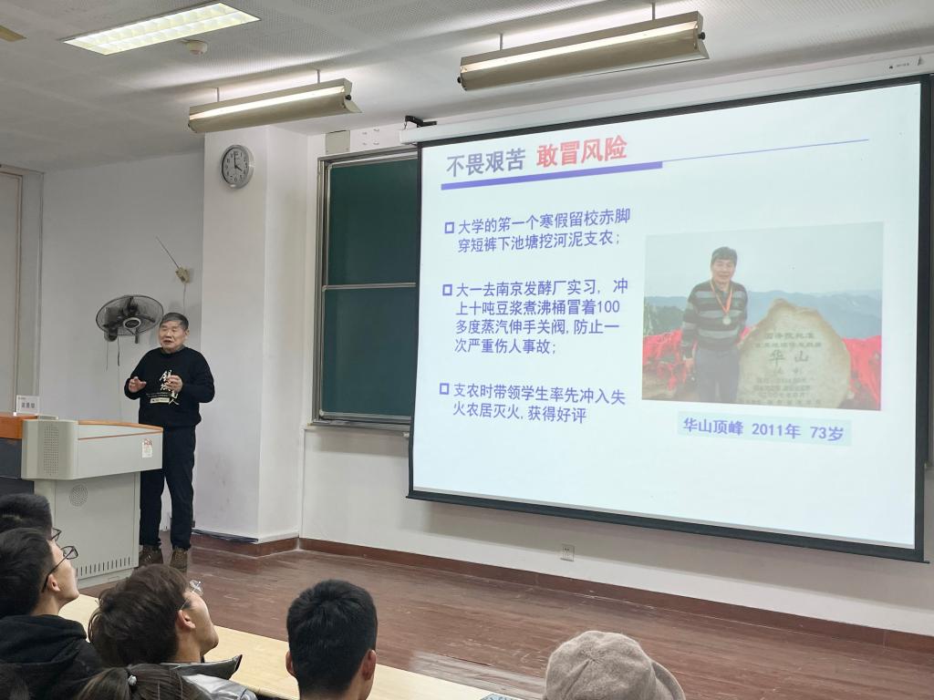 讲座伊始,诸葛健声情并茂地为同学们介绍了他的人生经历。他勤学苦读,以自立自强,顽强不屈的意志与精神,圆了大学梦。诸葛老师牢记“被祖国培养,不忘报国之恩”,在那个特殊的时代,他放弃国外优越的环境和高薪的待遇,毅然回国,发誓要为祖国的建设与发展贡献力量。随后,诸葛健又为同学们讲述了他科学研究、服务产业的经历。在他的讲述中,同学们看到了诸葛老师“善于实践,勇于创新”的发酵精神。最后,他教导同学们:“只有虚心好学、深知自己的不足,才能使自己更快地成为一个优秀的人才。”