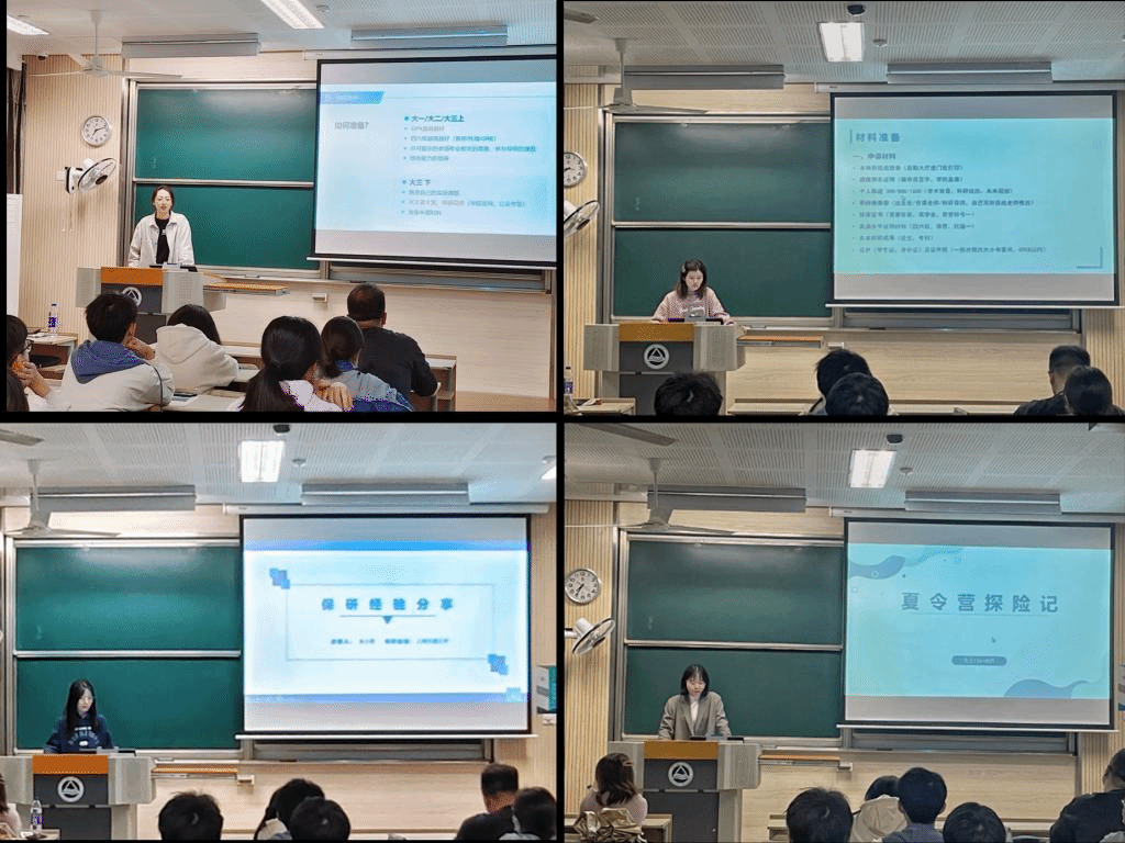 、华中科技大学、上海交通大学、中国科学技术大学、浙江大学拟录取的宋敏霞、罗舒元、朱小青、孙丹、李梦轩五名同学依次上台交流经验。她们根据亲身经历,从保研条件、时间节点、材料准备、联系导师和面试要求等多方面进行了详细介绍,并耐心细致地解答了同学们提出的疑惑,给予了很多中肯的建议。