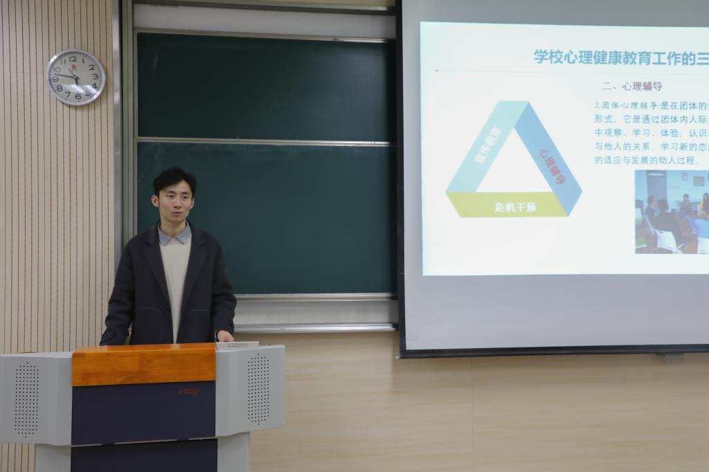 随后,宋大有以《心分享、新起航》为主题,对朋辈心理工作的角色定位和工作职责进行了说明,对工作中的技能与策略进行了全面讲解。他提出,心理委员和宿舍长是中国AV