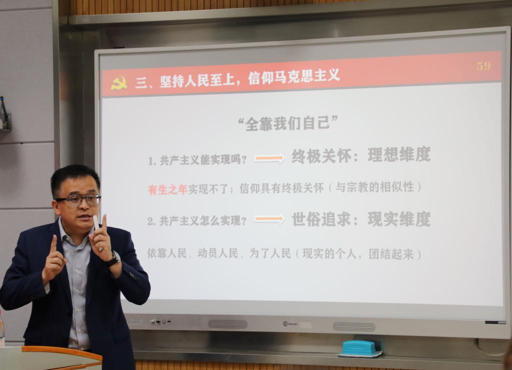 马克思主义学院唐忠宝教授以《学习新思想坚定理论自信》为题开讲。唐忠宝教授围绕学习贯彻习近平新时代中国特色社会主义思想,以党的二十大精神为切入点,聚焦“十个明确”的精神实质和丰富内涵,重点从“反对历史虚无主义”“坚持中国式现代化”“信仰马克思主义”等方面着眼分析,以当今网络热点话题讨论为案例开展解读和交流,旨在深入浅出地以年轻人喜闻乐见的宣讲形式和思维方式,向青马班学员传播新时代新思想,引导广大青年树立正确价值观、厚植爱国情怀,与国家同呼吸、与人民共命运,唐忠宝教授的精彩分享为全体学员带来一场耳目一新的思想盛宴。