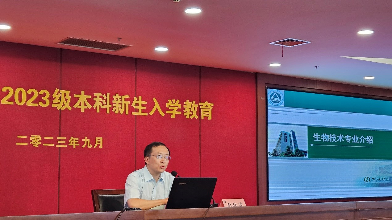 他从办学指导思想、专业定位、培养目标、课程体系、毕业去向等方面详细介绍了生物技术专业。并向新生详细解释生物技术与生物工程专业的区别。