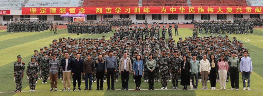 党委书记程捷音,院长刘龙,党委副书记、副院长林丹,办公室主任徐静,2022级班主任代表及全体辅导员来到军训场,观摩阶段性训练成果,为参训同学送上最亲切的慰问和祝福。