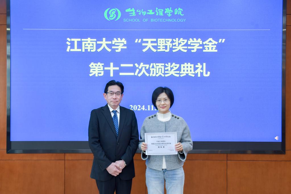 程捷音宣读获奖名单。陈启航等27名同学获得本次“天野奖学金”,代谢工程团队获评团队奖。颁奖仪式上,程捷音和刘龙为一等奖颁奖,李江华为二等奖颁奖,王友谊为三等奖颁奖,小林俊一代理天野源之为团队奖颁奖。