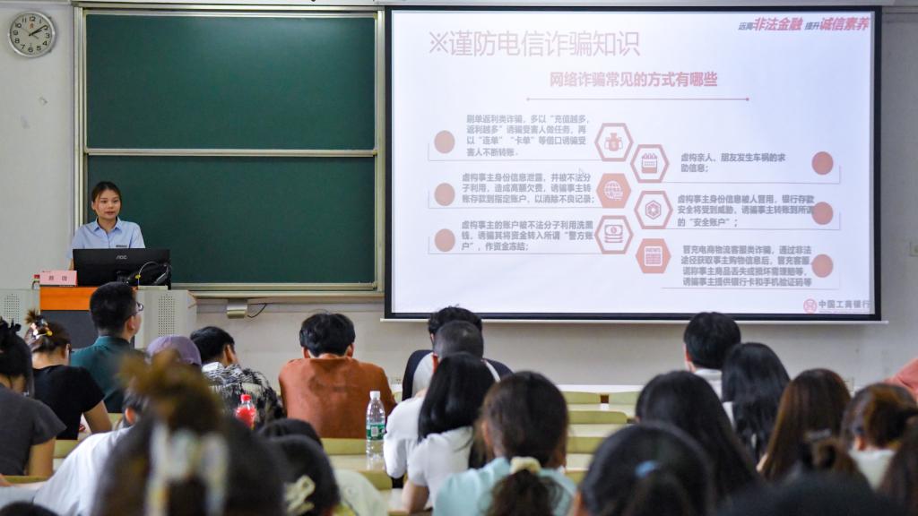 支行蔡微行长受邀担任主讲嘉宾,学院研究生辅导员张同舟和150余名学生代表共同参加活动。本次讲座紧紧围绕“远离非法金融,提升诚信素养”这一主线。蔡微行长从“识破陷阱”“筑牢防线”“守护信用”三个板块切入,通过真实案例、数据对比和法律法规解读,层层递进揭示非法金融活动的危害与防范要点。“刷单返利、虚假购物、冒充客服退款……这些看似简单的骗术为何屡屡得逞?”蔡微通过高校学生受骗案例,剖析了诈骗分子利用大学生社会经验不足、追求兼职收益等心理设计的陷阱。蔡微还专门介绍了征信的相关知识,她结合《征信业管理条例》,阐释了逾期还款、过度借贷对个人信用记录的影响,并纠正了“花钱修复征信”等常见误区,引导同学们要珍惜个人信誉,践行契约精神,合理合法开展各类金融活动。