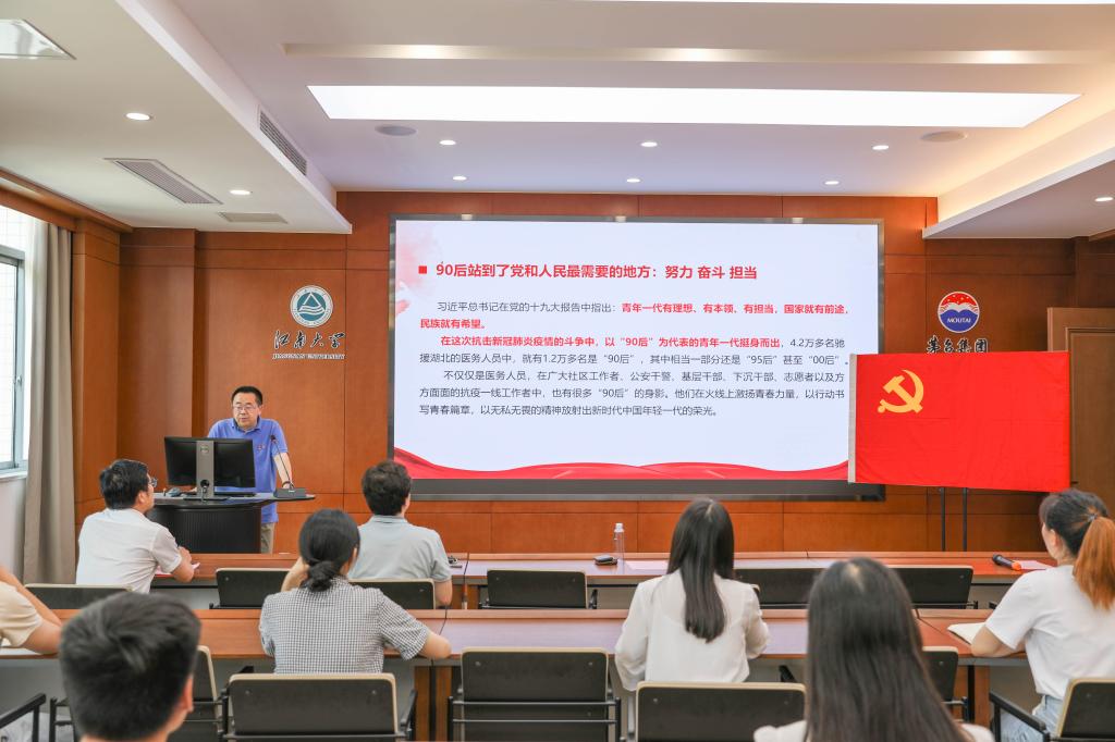 宣誓仪式之后,院长许正宏同志向新党员作了题为《不忘初心、牢记使命 做有担当的新时代青年党员》的专题党课。他以生动的语言、详实的事例,从解读中国共产党人的初心使命入手,结合抗疫期间90后彰显的青春蓬勃力量、当前中美博弈背后的现实逻辑,以及学院一流学科发展历史的回溯与展望,激励青年同志们认清当前“百年未有之大变局”,将“为中国人民谋幸福,为中华民族谋复兴”作为一生志业,提升学科专业认知,把论文写在祖国大地之上,以真才实学服务人民,以创新创造贡献国家。