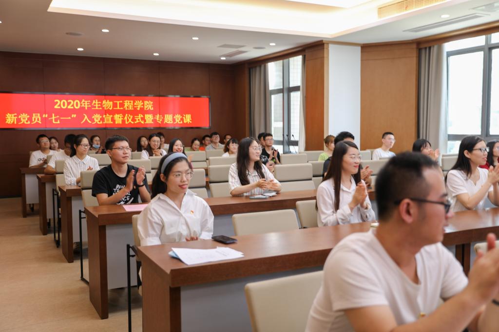 仪式在庄严雄壮的《国际歌》声中拉开帷幕。随后,党委副书记周云龙同志宣读了新发展党员名单。在辅导员陆燊佳带领之下,全体参会人员面对鲜红的党旗,举起右拳庄严宣誓。一句句铿锵的誓言,一声声庄严的承诺,振奋的是使命在肩的勇敢担当,守牢的是党的理想信念和根本宗旨。之后,预备党员孙驰翔代表全体新入党同志发言,向党组织郑重承诺:不忘初心、牢记使命,秉承“善于实践,勇于创新”的发酵精神,做有理想、有本领、有担当的青年党员。