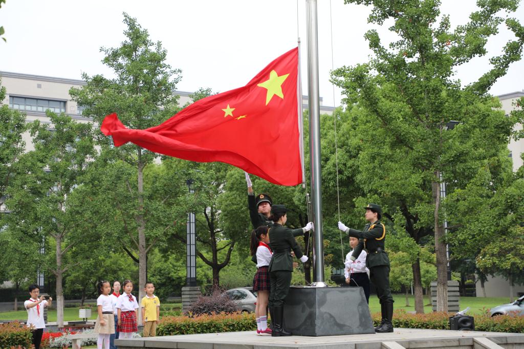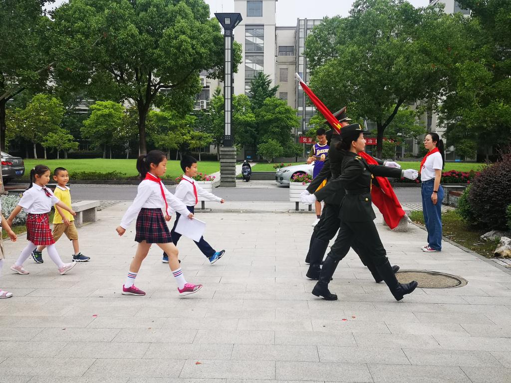 首先参加活动的小朋友给嘉宾和父母敬献红领巾,并担任升旗手、护旗手,与国旗班同学一同出旗、升旗,同唱国歌。通过亲身参与,坚定理想信念,增加爱国情怀。国旗班同学通过给小朋友的示范,也进一步体悟到了青年的责任与荣耀。