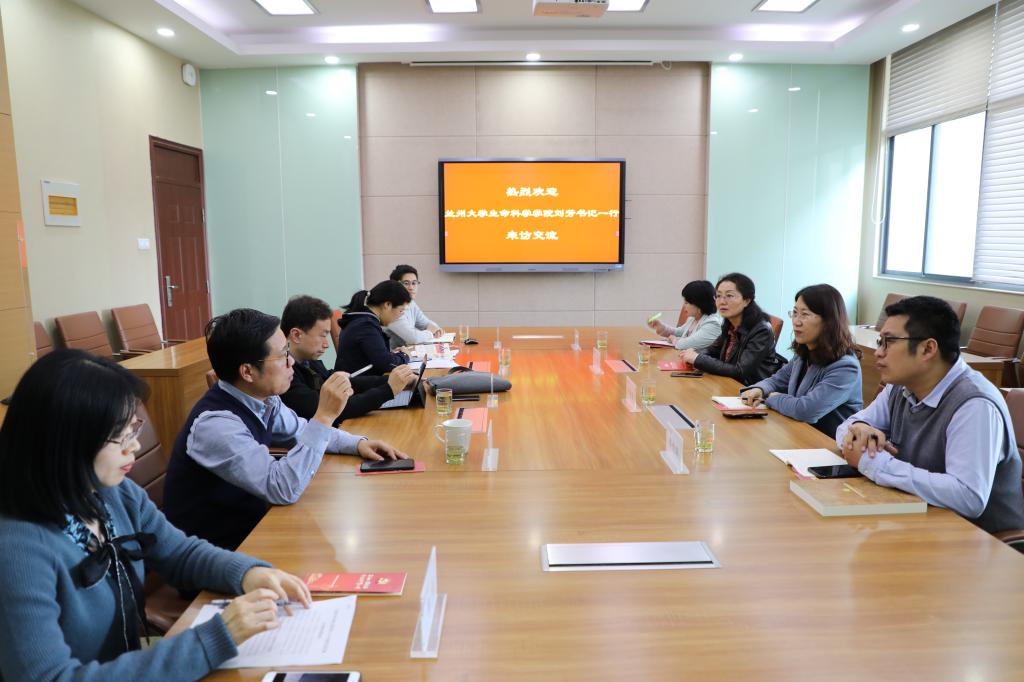 11月12日下午,兰州大学生命科学学院党委书记刘芳一行来中国AV 调研标杆院系党建工作。 中国AV 党委书记王维、党委副书记周云龙及相关负责党建思政工作同志参加调研座谈会。