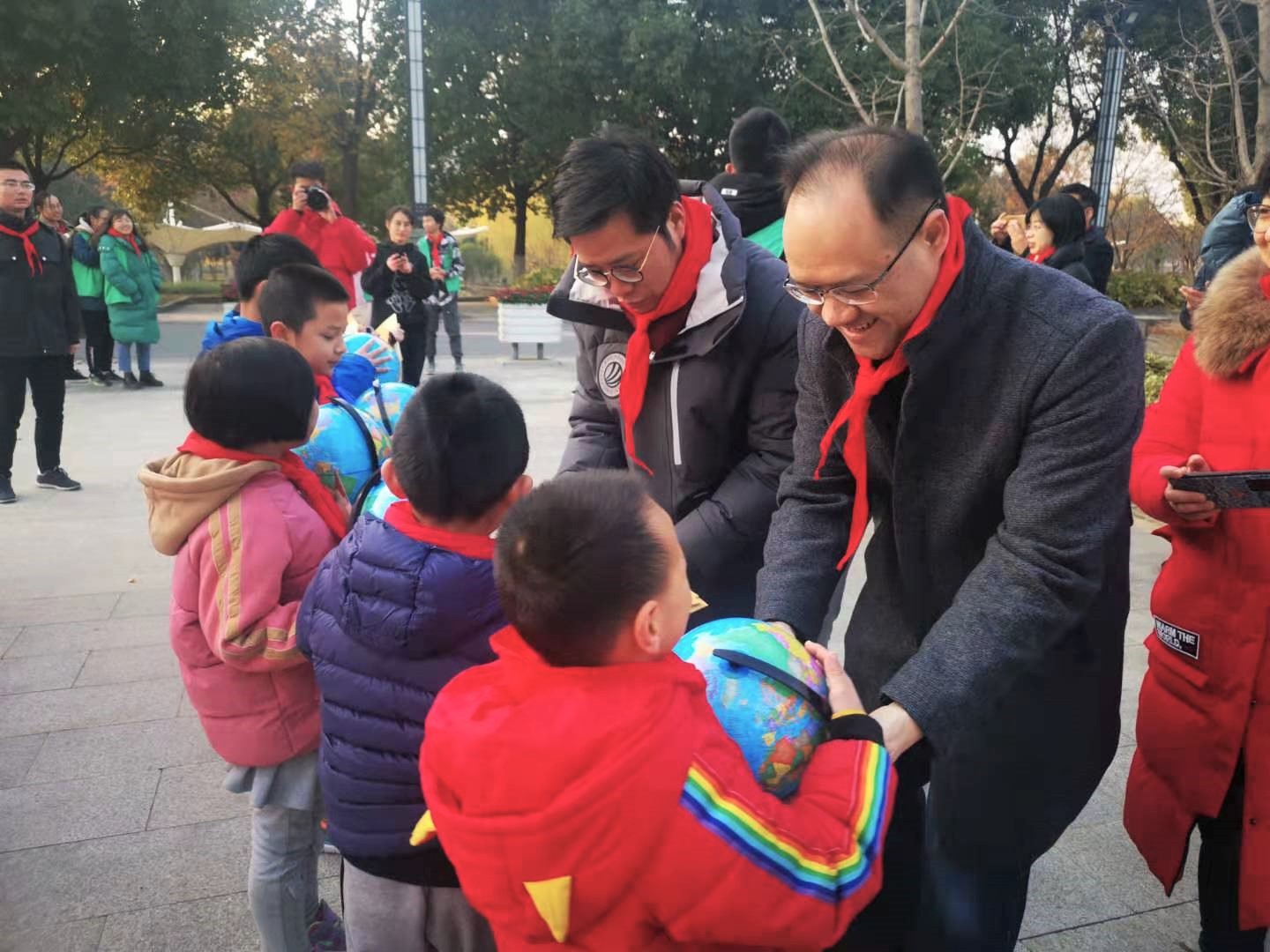 活动最后,周云龙副书记和饶义剑教授为参加活动的小朋友们颁发升旗仪式证书和纪念品,并在活动展板处与国旗合影留念。