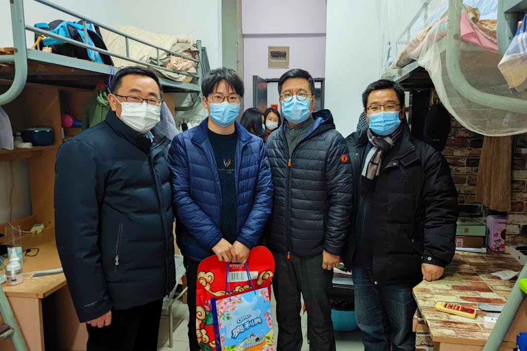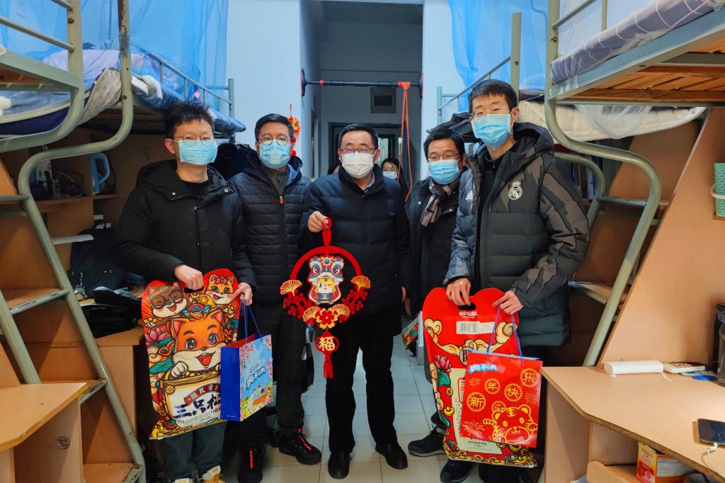 许正宏带队走访宿舍并与学生亲切交谈,提醒同学们一是要提高安全意识,遵守留校管理办法,加强个人防护;二是要保持顺畅沟通,及时有效与家长、导师、辅导员联系,有需求主动提,有情况赶紧报,有困难立即帮,三是规划有序假期,注重劳逸结合,过一个收获年、平安年、幸福年。一行人为同学们送上精美慰问品和新春对联。
