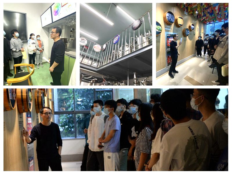 酒科技馆,了解酒的相关历史、发展和制作工艺等。在酿酒实践基地门口的墙上,挂着介绍啤酒酿造历史的酒桶,郑老师精彩绝伦的讲解让同学们身临其境,如同亲身见证了前人发现并深化有关酿酒工艺的历史。基地内部展示了啤酒精酿的生产设备,郑老师就啤酒的制作工艺以及啤酒发展至今的改进和突破等内容,对同学们进行了科普介绍。