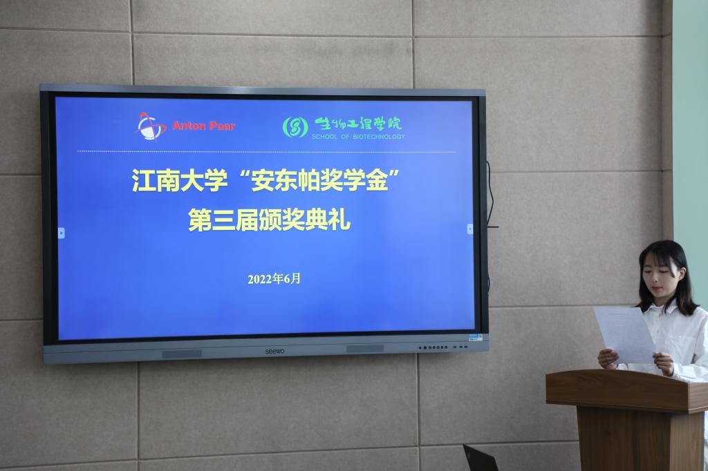 首先,李崎宣读第三届“安东帕奖学金”获奖名单,钮成拓、陈献忠、李崎分别为三等奖、二等奖、一等奖获得者颁发了获奖证书。颁奖环节结束后,学生代表酿酒1902班林玉琪发表获奖感言,她从专业学习、科创竞赛等方面汇报了自己大学三年来取得的成绩,并向安东帕公司表达了诚挚的感谢。安东帕是一家总部位于奥地利,拥有百年历史的跨国企业,在密度和浓度测量,溶解二氧化碳的测定,以及在流变学和粘度测量领域处于世界领先地位。程张红向在场的老师、同学介绍了公司的历史、业务情况。她还介绍了安东帕公司开拓创新、精益求精、高标准高要求的中国AV。她希望同学能努力学习,砥砺奋斗,取得更大的进步。随后,陈献忠代表 中国AV