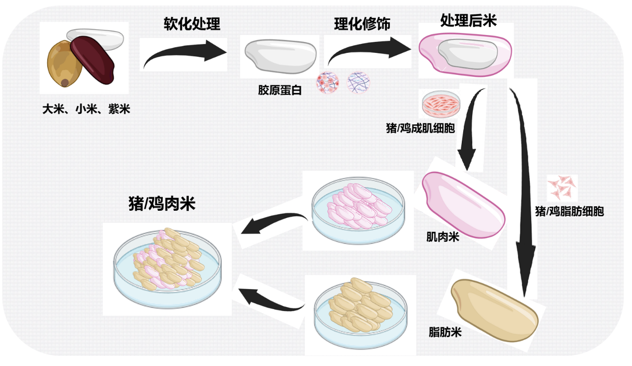 “鸡肉米、猪肉米是细胞培育肉与大米、小米和紫米有机结合生成的一种组合食品。”据中国肉类食品综合研究中心、北京食品科学研究院首席科学家王守伟介绍,该团队开发的鸡肉米、猪肉米系列食品,主要是利用鸡、猪肌肉和鸡、猪脂肪细胞贴壁生长的特性,将大米、小米及紫米进行预处理后作为支架,为猪、鸡细胞生长提供微环境,使细胞在其表面增殖和分化,最终形成的一种营养均衡和成分可控的组合食品。