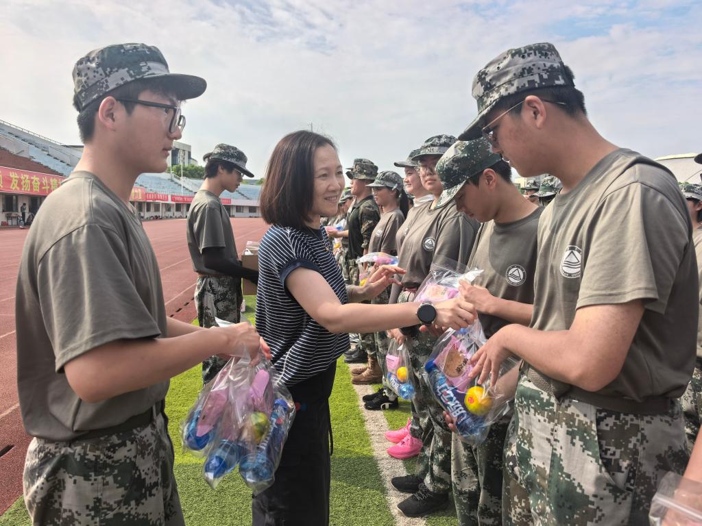 慰问现场,领导老师们为每位新生送上精心准备的慰问礼包,并亲切地询问大家的军训感受和生活情况。一句句关怀的话语,像一阵阵清风,驱散了训练的疲惫,让新生们在严格的军训中感受到了学院大家庭的温暖。