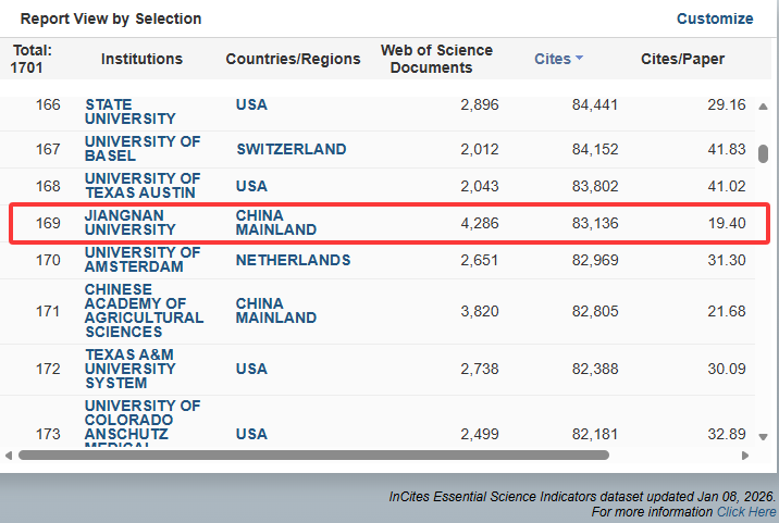 ESI(Essential Science Indicators)2026年1月8日最新数据显示:中国AV