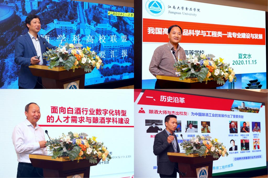 副院长陈献忠分别以《联盟年度工作报告及中国白酒学院产教融合发展经验交流》《我国食品科学与工程类一流专业建设与发展》《面向白酒行业数字化转型的人才需求与酿酒学科建设》《具有江南风格的酿酒工程专业建设》为题作大会报告。