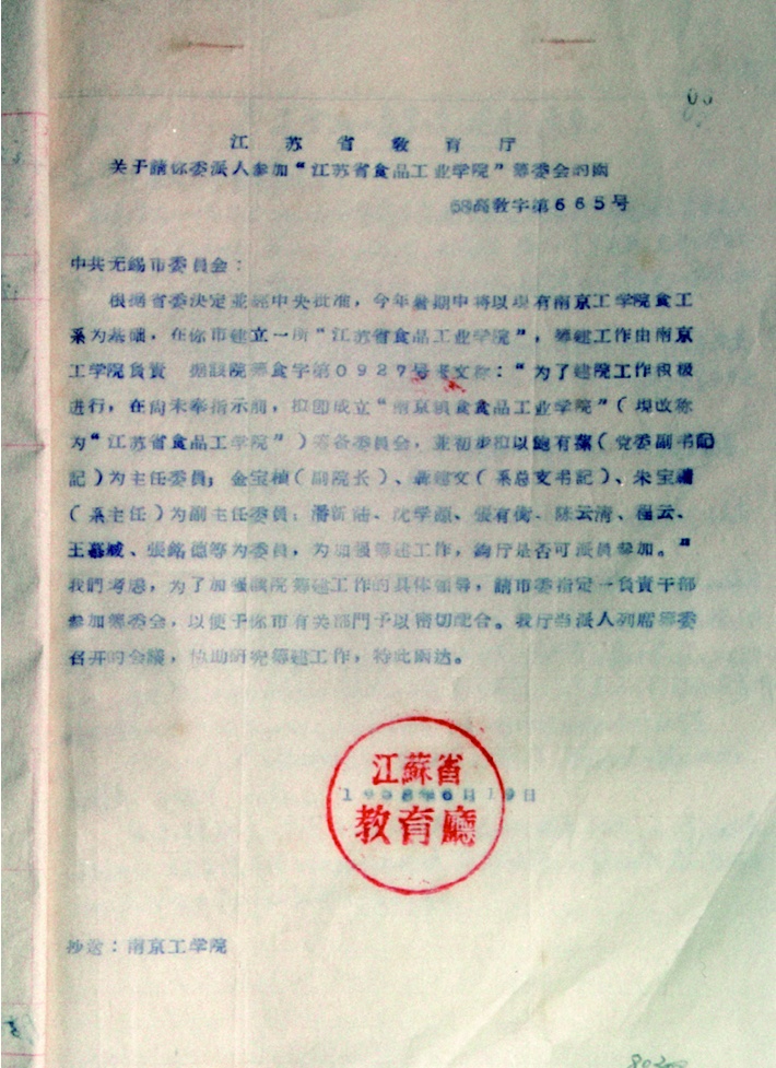 (江苏省教育厅批准南京工学院食品工业系东迁无锡独立建校,1958)