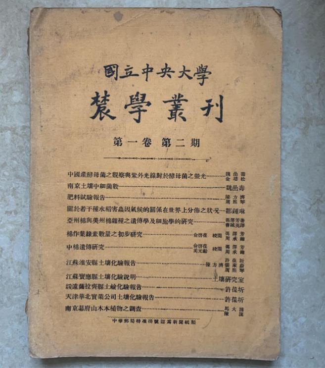 (原国立中央大学《农学丛刊》上刊登的魏喦寿、金培松发表的发酵科学研究论文,1934)