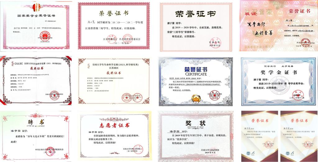 大学期间曾获江苏省三好学生、江苏省大学生抗疫先进个人等多项荣誉,主持国家级重点大创项目以优秀结题,其成果获得全国大学生生命科学竞赛国家一等奖,并发表SCI论文1篇,参与申请发明专利1项。获国家奖学金、一等奖学金、“高水平学科竞赛”奖学金等累计7万元。积极参加志愿服务,事迹被人民日报、新华社、共青团中央等多家官媒报道。