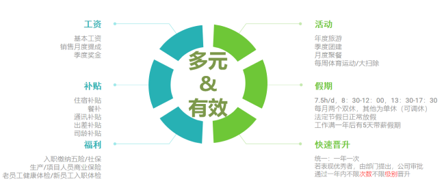 基本工资、绩效奖金/提成、出差补贴、节日福利、健康体检、年度旅游、带薪休假、团建、聚餐