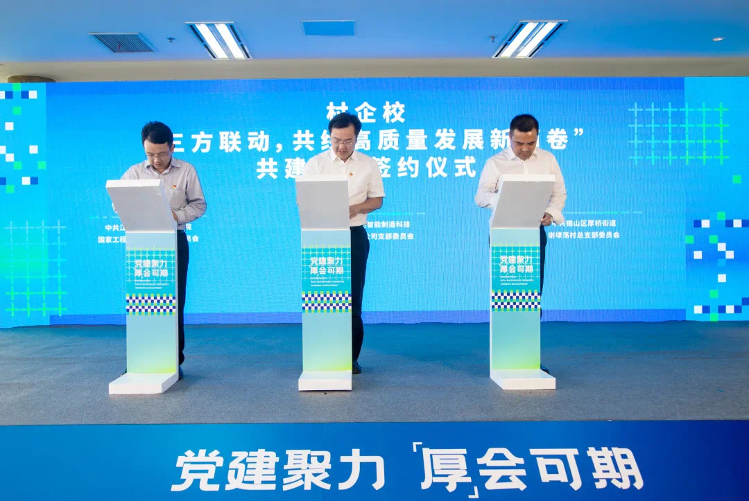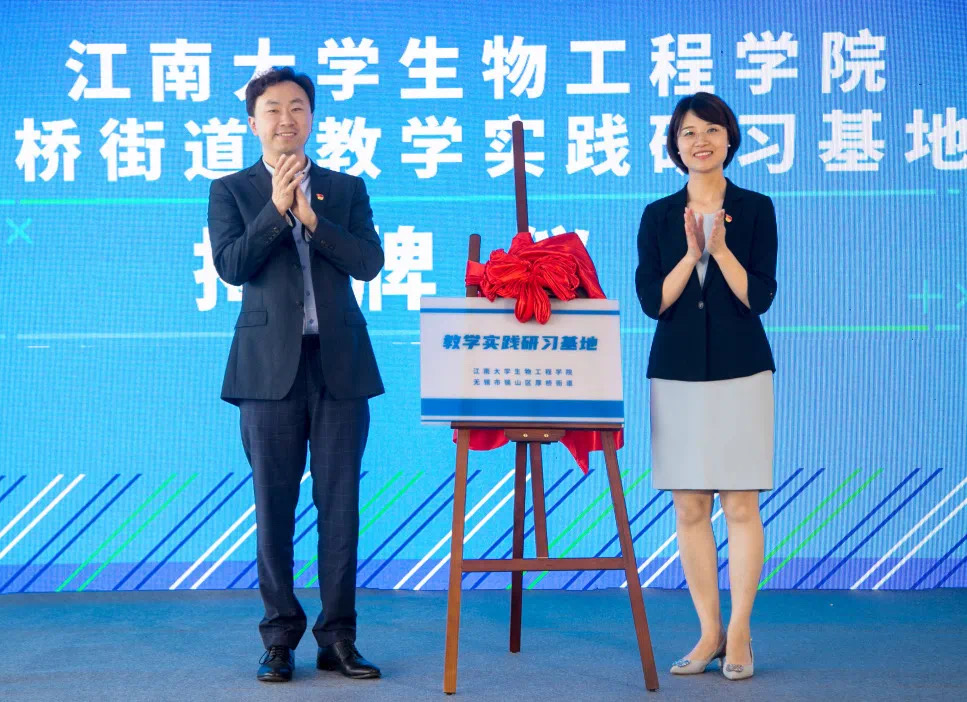 党委书记王维、厚桥街道党工委书记张晓庆共同为“教学实践研习基地”揭牌,为学院师生在教科研成果转换、人才培育等方面提供帮助和支持。粮食发酵工艺与技术国家工程实验室常务副主任李兆丰、中科微至董事长李功燕、谢埭荡村党总支书记华东明为村企校“三方联动,共绘高质量发展新画卷”项目进行签约。今后村企校三方将围绕组织联动、党员联动、服务联动“三联动”探索共同发展之路,并就特色农产品研发配套和深加工产品领域开展合作,真正实现“党建引领、发展共赢”。