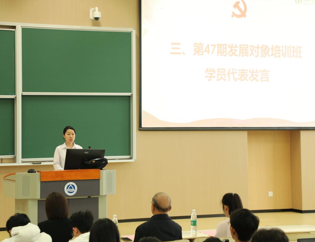 2022级本科生刘垚代表第47期学生党员发展对象培训班新学员发言,她从遵守纪律、勇于担当、握技强能角度承诺将做到“坚定不移听党话、跟党走,行为有指南,行动有标准,怀抱梦想同时脚踏实地,争做先锋模范表率。”